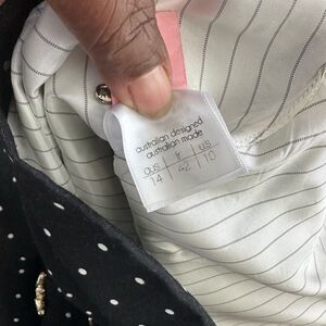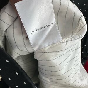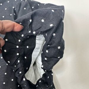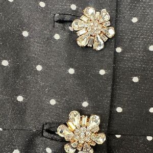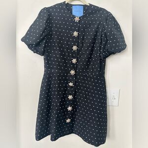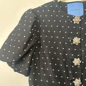 black/white cotton blend polka dot embroidery round neck front button fastening crystal-embellished buttons short puff sleeves A-line skirt thigh-length