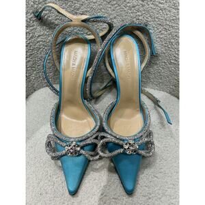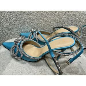 Mach & Mach Crystal Embellished Double Bow Heels Blue Satin, Size 38 - Like New