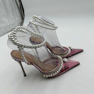 These stunning luxury heels feature a sleek pointed-toe design in glossy metallic pink with a transparent PVC upper that creates a modern, elegant silhouette. Adorned with dazzling crystal embellishments at the toe and intricate pearl detailing along the straps, these stilettos exude sophistication and glamour. A delicate ankle strap draped with pearls, and a fine silver chain enhances the feminine appeal, while the slim gold-toned stiletto heel offers a chic and graceful lift. Perfect for weddings, evening events, or upscale occasions, these shoes combine contemporary style with opulent details for a truly standout look. Although this is new shoe the back show color discoloration, see last two pictures for further details.