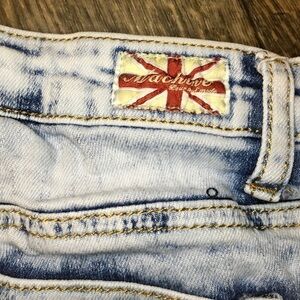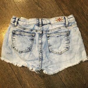 These Machine shorts feature a light wash denim, an acid wash, raw fringe hems and a mid rise.