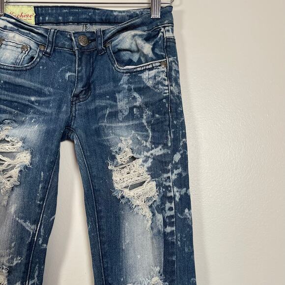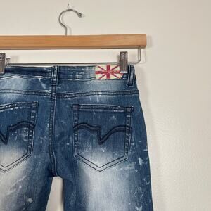 Features: Medium wash blue jeans, bleached effect, factory distressing and paint splatters