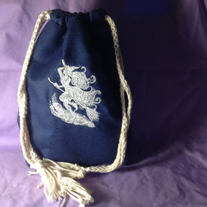 This 8x10 pouch is adorned with a machine embroidered witch with her broom in flight. This pouch is made of cotton and lined with a cotton blend and a hand made i-cord drawstring. Great for tarot cards, crystals, treasures and trinkets.