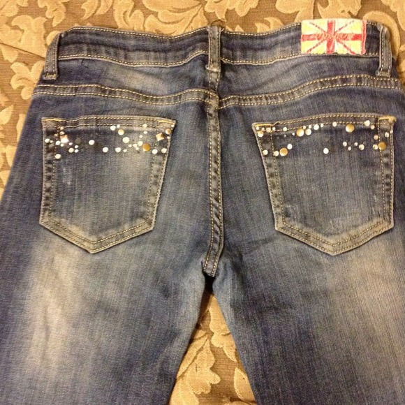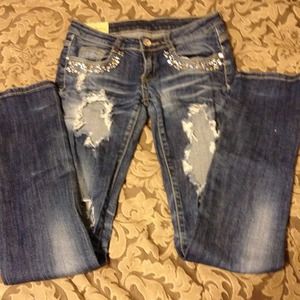 Machine Jeans with Extremely Distressed Factory rips. Cute over leggings or could be cut into shorts. SIZE 3