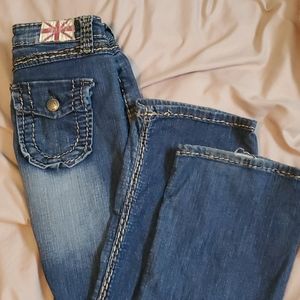 Super cute 😍 distresses Machine Jeans. Great condition! Only has some wear on the bottom (shown in picture). Id say it's a Boot cut with a little more flare on the bottom .