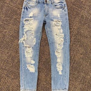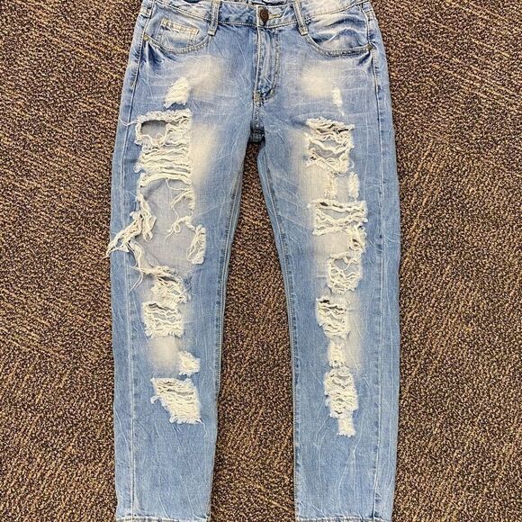Like new Machine Novelle Mode low rise medium wash distressed, destroyed ripped capris jean. Size 5 juniors, Has rips and distressing down the leg. Traditional 5 pockets, zip fly and button closure. Has little stretch when worn and soft denim feel. See pictures for details.