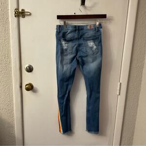 Style: Distressed Skinny, 5 pocket jean with rainbow stripe on outer leg