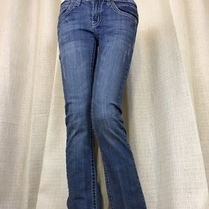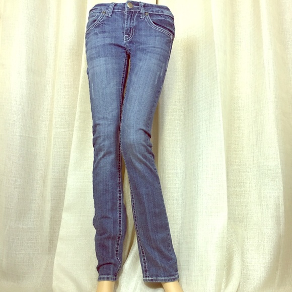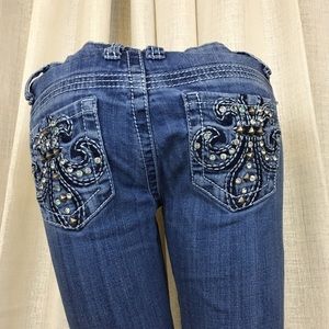 There is a rhinestone missing from each side, as seen in 6th and 7th picture; including a few rhinestones have turned blue. Also, the zipper has turned green, as seen in the 8th picture. I bought these from Francesca’s Boutique. They say size 27 but they are really a size 24 or 0/1.