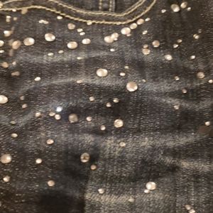 Blinged out size 0 jeans by Machine. Rhinestones, rips on front legs and back pockets. Very cute. Excellent condition