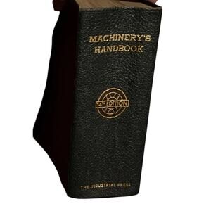 Vintage “Machinery’s Handbook” 14th Edition, published by The Industrial Press. This is a classic machinist/engineering reference. The book shows signs of use: water-staining on interior covers, previous owner’s stamp, and some handwritten reference notes.