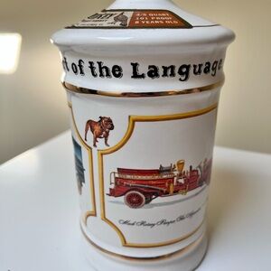 Unique ceramic decanter featuring a gold bulldog topper. Decorative design with vintage fire truck illustrations.