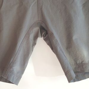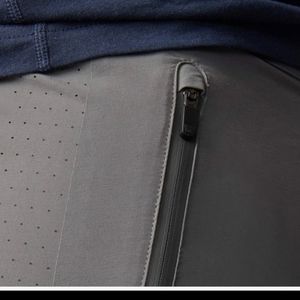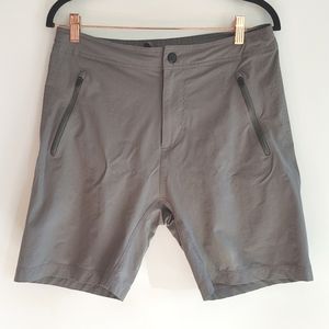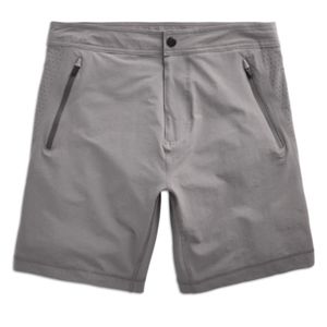 Mack Weldon 4-Way Active Short in Gray. 95% Nylon, 5% Spandex. Water-repellant. Bonded zip pockets, laser cut ventilation panels, interior draw cord with snap button closure.