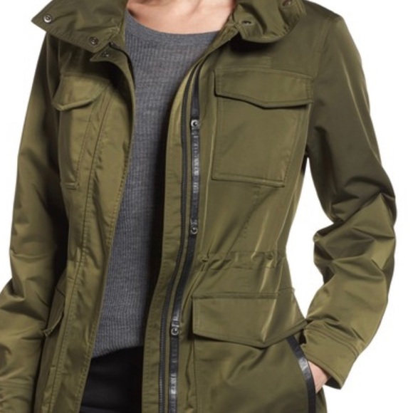 A water-resistant jacket offers practical utility with a wind-blocking stand collar, plenty of pockets to warm your hands and stash your gear, and an internal drawstring for waist-defining flattery. Leather accents polish the look. - 34" length (size Medium) - Hidden front zip/snap closure - Stand collar with zip detail - Long sleeves with hidden-snap cuffs - Chest flap pockets; front flap/welt pockets - Lined - 100% polyester - Dry clean - Imported - Coats