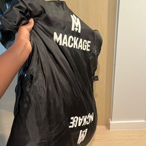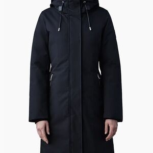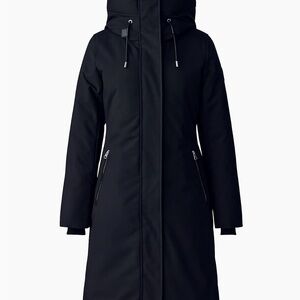 Sleek black puffer coat by Mackage. Features a hood and long silhouette. Perfect for cold weather. Arctic rated: Down to -25°C