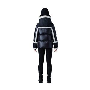 CYRAH is an Arctic Twill mixed media down parka for women with a stand collar. Plush shearling lining around the edge of the hood, back yoke and sleeve hems deliver a tactile accent.