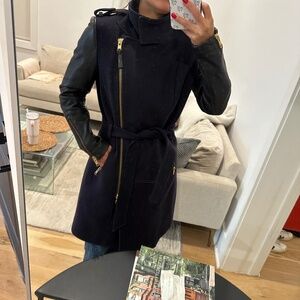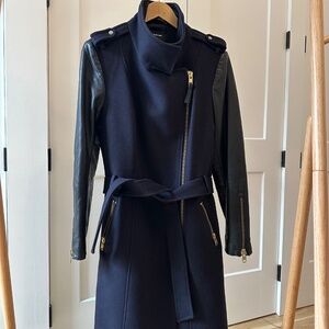 Mackage Dale belted navy wool trench with black leather sleeves, gold hardware, two zippered pockets and box pleat at center back hem.