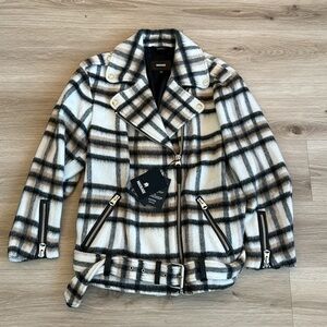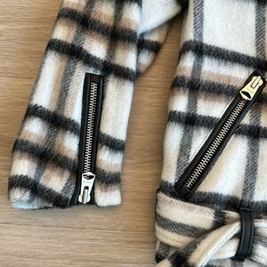 GRACIE is a belted biker with a relaxed drop waist cut and tapered zip sleeves crafted from soft recycled wool and mohair. Defined by a classic asymmetrical zip, snap notch lapel, and epaulette drop shoulders, the statement plaid knit showcases thoughtful tailoring. An iconic multi-season style elevated with statement detailing. Biker jacket silhouette Recycled wool and mohair Asymmetrical zip front closure Removable roller buckle belt Drop shoulders with snap epaulettes Tapered sleeves with zip gusset vents Zip waist pockets Inside pocket Relaxed fit for on-the-go comfort SIZE FIT RELAXED – Loose fit for on the go comfort. Designed to be worn with heavier layers. Model is 5' 9" / 175 cm and wears a size XS Coat length from shoulder to hem: 25" / 63.5 cm COMPOSITION CARE INSTRUCTIONS Shell (Woven): 65% wool, 20% Polyamide, 10% Mohair, 5% Acrylic. Combo: 100% Lamb Leather. Lining: (Woven): 100% Viscose. Dry clean by leather specialist using oil based solvent only.Do not use perchloroethylene.