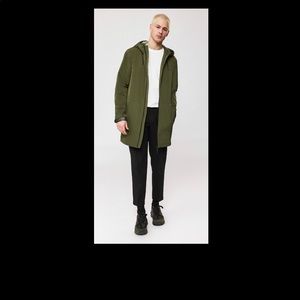 Light weight jacket with double zipper. It’s water resistant so it great for the rain. Olive green color 😍jacket. Women can wear this jacket as well! 😎 equivalent to a size small in women.