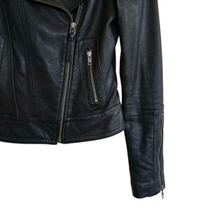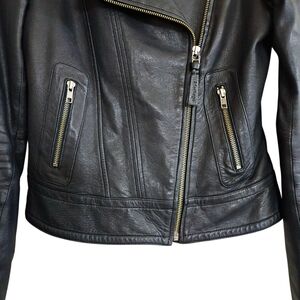 This black, super soft, lamb leather, Jordana, moto style jacket by Mackage for Artizia is in great, gently used condition! I've taken excellent care of this leather jacket, I do not think you will be disappointed! Only sign of wear I see is when I just barely touched the fabric at the top of back neckline (internally) with black polish. It doesn't effect the wear or visibility at all, just want to disclose everything. Size xsmall. I'd say true to size, but please check measurements to ensure proper fit. Chest width is approximately 17" wide. Total length from top of shoulder to bottom is approx 21" long. Width at narrowest (natural waistline) is approx 14 1/2" wide. Being leather, there is a small amount of give.