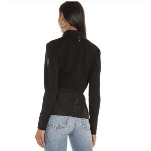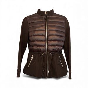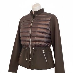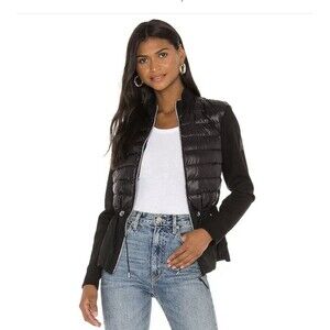 The Mackage Joyce Puffer Jacket features a front zipper closure and a drawcord waist. It also has side zipper pockets, rainwear peplum, and jersey collar, back upper body and sleeves. The self is composed of 53% poly, 41% cotton, and 6% spandex. The lining is 100% nylon and combo 2 is 100% poly. The fill is 90% duck down and 10% feathers