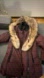 Elegant maroon puffer with plush faux fur hood. Ideal for cold weather.