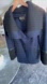 Sophisticated navy color wool with black details on the collar and sleeves, along with black leather trim around the pockets and sleeves. Features a sleek versatile design.