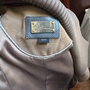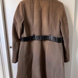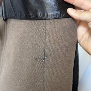 Fully lined wool/cashmere coat with leather details, with removable knit collar for extra layer/warmth (connected by zipper).