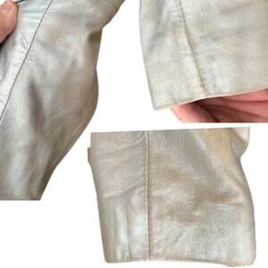 Mackage Montreal cropped moto jacket in metallic silver lambskin. Soft genuine leather with a subtle iridescent sheen, gold-tone hardware, and classic biker details. Fully lined. Great condition with natural variations in color typical of metallic leathers. Size XS. Mackage Leather jackets retail for $1000+