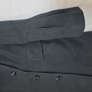 Sleek black coat with leather trim. Features a metal logo plate. excellent condition no damage itall beautiful style high neck bell sleeves front pocket fully lined size XS. You have a question don't hesitate to ask.