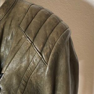 Front zip. Various zip compartments. Soft leather. Inner lining. Color is military green. 19” bust. 19” length
