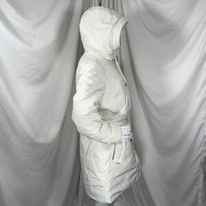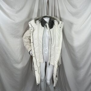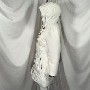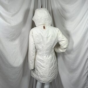 Some stains on parka as seen in the photos. These stains may or may not come out. The leather is bleeding as well and may come out with professional cleaning.