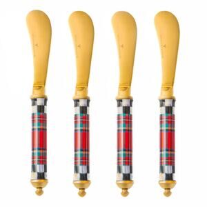 Spread on the joy (and the brie) with this spreader set. This quartet of stainless-steel spreaders with a golden finish features handles with a clear enameled coating bedecked in red tartan.