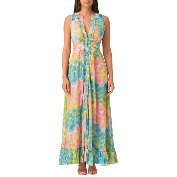 A striking statement piece, this Mackenzie Mode maxi dress is designed in a dreamy watercolor pastel print with a romantic ruffle trim and flattering open back silhouette. Crafted from a luxe silk-cotton blend, the sleeveless design features a v-neckline, button front closure, and a gathered hemline with a subtle high-low effect. The vibrant color palette and flowing movement make this the perfect standout piece for resort getaways, summer events, or garden parties.