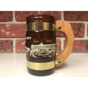 Mackinaw City Michigan Amber Glass Wooden Handle Beer Mug Collectible Souvenir