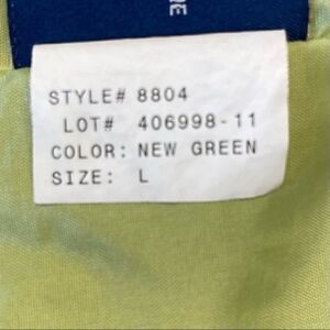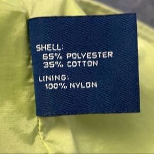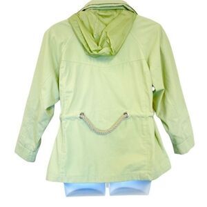 Size large color, new green, long sleeves rope drawstring at waist pockets snap button front closure lined approximate measurements laying flat under arm to under arm 20 inches across length 28 inches