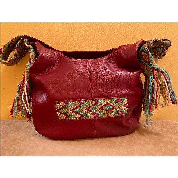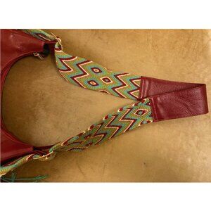 Macoly beautiful dark red leather pocketbook with wide zigzag woven strap with tasselated ends for comfort and buckles for adjustability and middle leather section. Fully lined In water resistant black fabric. One outside 7" zipper pocket and on the other side a matching woven inset. Inside one zipper pocket and 3 open top pockets - one for phone, one for pen/pencil.
