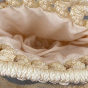 Macramé hand bag excellent like new condition, very heavy and thick. Light buttery creamy color. 9 1/2” x 11”. Handles 20”