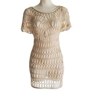 Macramé Crochet Open Weave Dress Beach Coverup Beige Size S/M