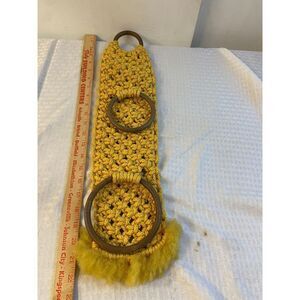 Macramé towel hanger with wood rings. yellow vintage 70’s. measures 22x5". good used condition.
