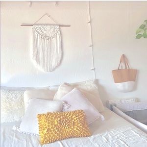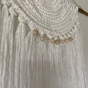 Semi circular beaded white macramé made from wooden Beads, frayed utility cord, bamboo, and twine. Measures 24”x 22” not including the hanging string. Very Cute and Boho, Simple but Beautiful Piece.