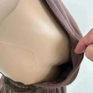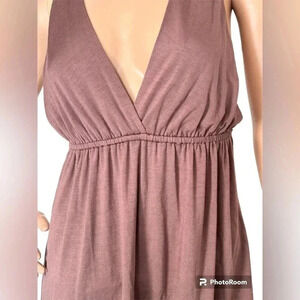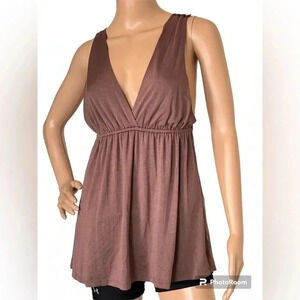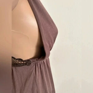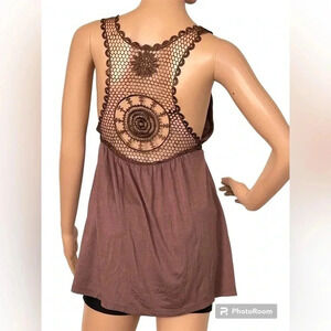 Gorgeous tank with intricate macrame backing. I am assuming this is a Medium as you see how much cup space this top has on the model. There is an elastic band under breasts creating gathered pleating in a peplum style. This too probably fits a C&D cup nicely. There are no tags so please see measurements before purchase. There is no pilling, snags, stains, fading or any signs of excess wear. Excellent condition!