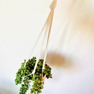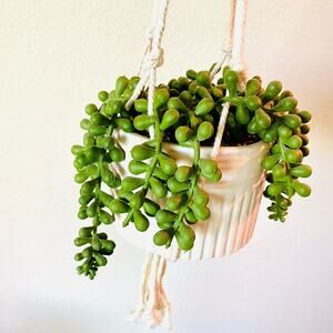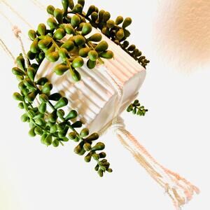 Macrame Faux Plant Planter White Ceramic Etched Pot Accent Decor String Pearls