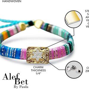 Unique Handwoven Star of David Artwork: Each bracelet is meticulously handwoven with vibrant blue, white, gold, green, and pink hues, making it a truly personal and artistic Judaica piece.