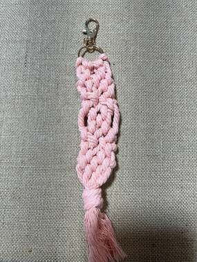 Handmade Macrame Keychain, Boho Pink Cotton Cord — New Condition. This stylish bohemian keychain features an intricate braided knot design in a soft blush pink color. It includes a gold-tone metal swivel clasp and ring for easy attachment to keys, bags, or backpacks. Perfect as a gift or a decorative accessory to add a touch of handmade texture to your daily essentials.