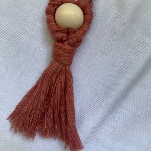 Macrame keychain: using rust color macrame cord, wooden bead and brass colored clasp.
