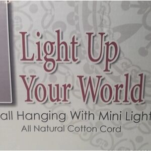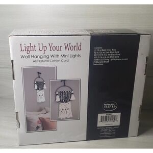 Light Up Your World-Makes 1 lighted wall hanging. Contains: (1) 10" (25.4 cm) metal ring. 42 feet(12.8m) 2mm white cord. 40 feet(12.19m) 2mm black cord. 30 feet(9.14m) 4mm white cord. 1 mini LED string of lights(batteries included. 1 Macramé brush. Complete Instructions.