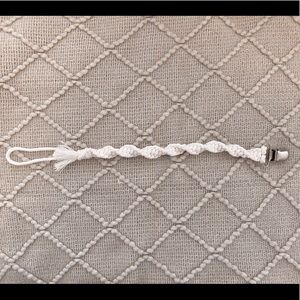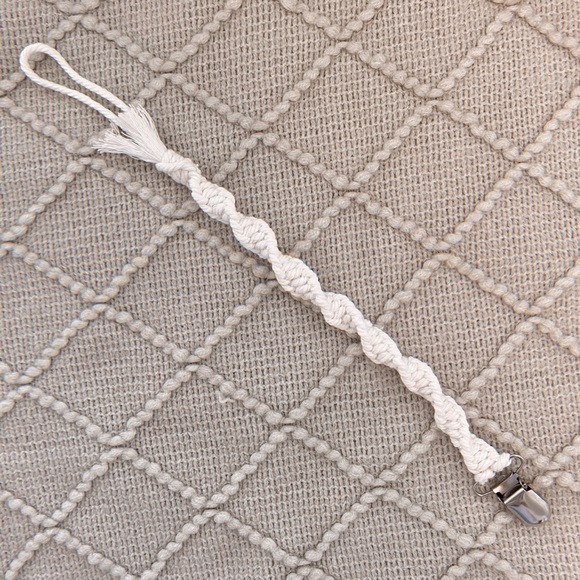 Handmade with white macrame cord. Brand new never been used. Sturdy metal clip on one end and loop to attach pacifier on the other. Fabric is tied in a spiral design. 10 inches long.