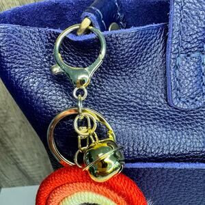 This is a New macrame purse charm. It has a clasp, a keyring, and a little bell on the top and then fluff balls at the bottom of the rainbow.