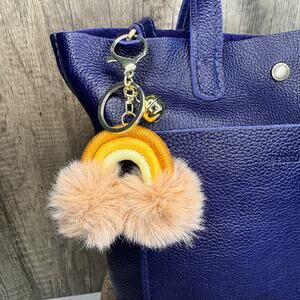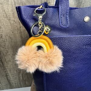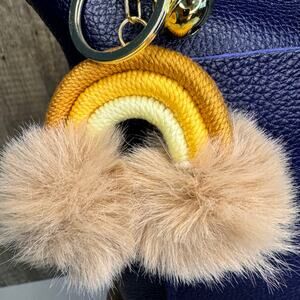 This is a New macrame purse charm. It has a clasp, a keyring, and a little bell on the top and then fluff balls at the bottom of the rainbow.