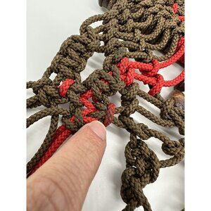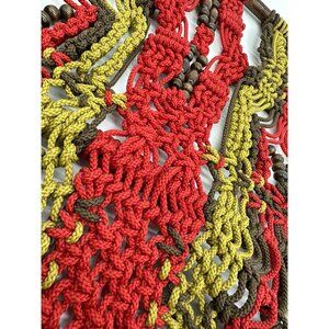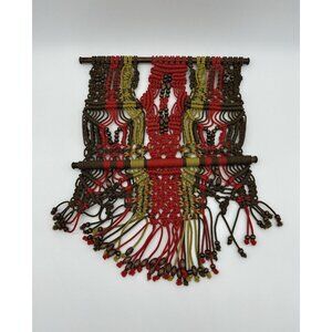 Macrame Wall Hanging Boho Wood Rod Green Red Brown Beads Striped Nylon Rope. This is a fantastic macrame wall hanging with two wood rods. It is in good condition but, there is one small stain. Please see the pictures for the full description.