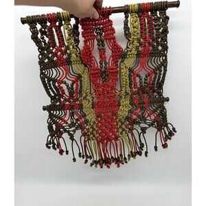 Macrame Wall Hanging Boho Wood Rod Green Red Brown Beads Striped Rope Art Nylon